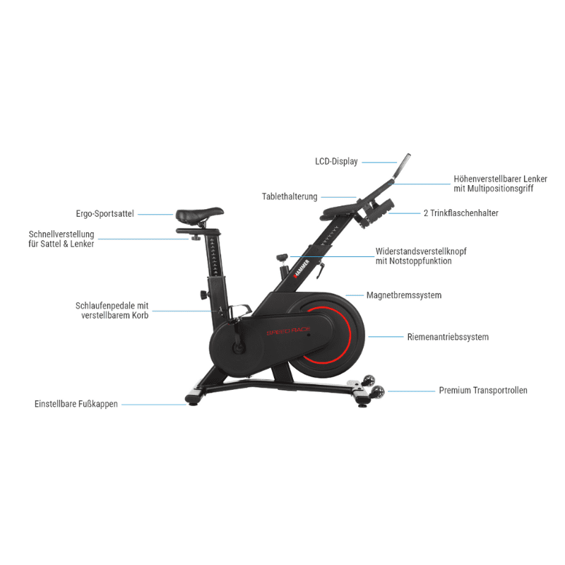 Tritt in die Pedale mit dem Bestpreis-Performer und steuere deinen Speed durch die moderne Magnetbremse. Das Hammer Racer Speedbike kräftigt deine Waden- und Oberschenkelmuskulatur und verbrennt dabei jede Menge Kalorien. Dein Herz-Kreislauf-System wird mit jedem Speed-Training gestärkt. Auch die Rumpfmuskulatur mit den vorderen und seitlichen Bauchmuskeln wird beim Indoor Cycling gefordert, besonders bei Temposteigerungen und im Stehen.