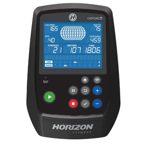 Großes Display mit vielen Angaben: Das 5,4″-LCD-Display zeigt Zeit, Ruderschläge pro Minute (SPM), Strecke, Zeit/500 m, Herzfrequenz, Wattzahl, Kalorien, Geschwindigkeit und mehr.