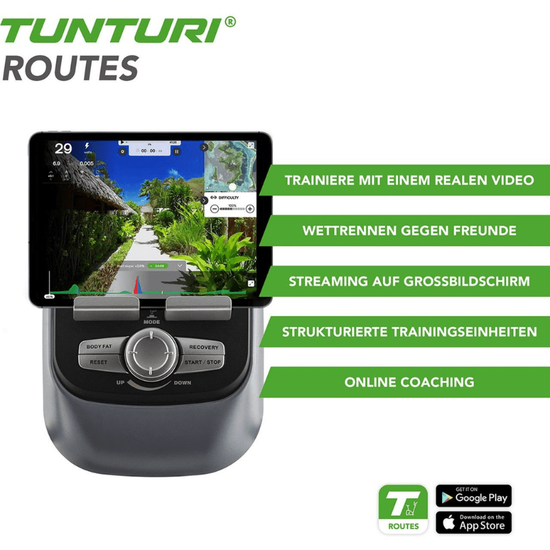 | Apps für Tablets und Smart Phones: | Tunturi Routes, i-Console+, Kinomap & Zwift |