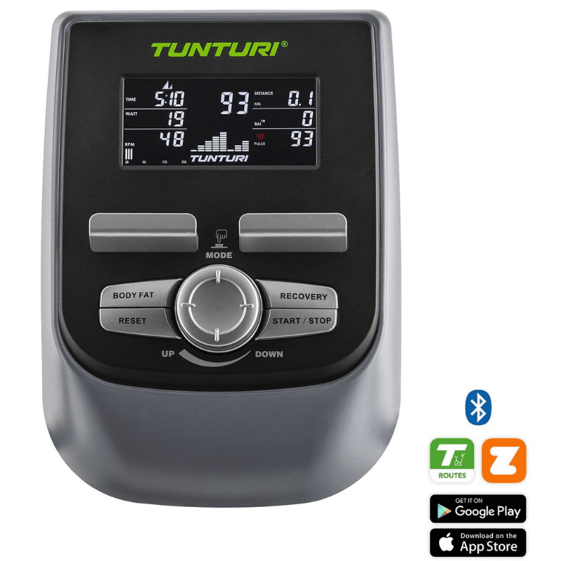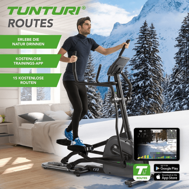 Damit ist das Potential aber noch lange nicht erschöpft! Denn dieser Tunturi Crosstrainer hat auch noch die Möglichkeit ein Tablet oder Smartphone via Bluetooth zu verbinden und somit die spannenden Möglichkeiten der Apps Zwift, Tunturi Routes, i-Console+ und Kinomap zu nutzen. Sobald Sie dies tun, entfalten sich ganz andere Möglichkeiten! Erstellen Sie sich einen Account und fahren Sie mithilfe Google-Maps durch die ganze Welt. Durch diverse Messungen können Sie Ihr Training auf dem Laufenden halten und auf Facebook oder Twitter mit Ihren Freunden teilen.